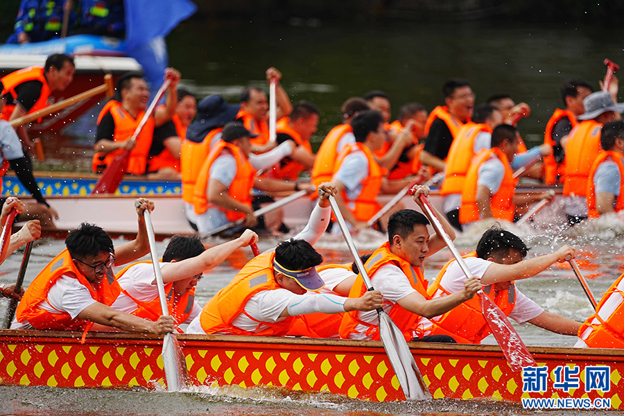 6月21日,云南省紅河哈尼族彝族自治州蒙自市舉行端午龍舟賽。驕陽下,碧浪中,隊員們鼓聲不絕、號子激昂、熱情高漲,整齊劃一的動作濺起層層水花。(蒙自市融媒體中心)