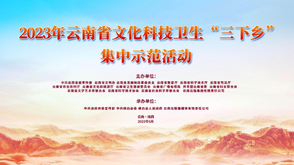 6月27日,云南省將在迪慶州維西縣組織開展2023年文化科技衛生“三下鄉”集中示范活動,進一步動員社會各方力量全面推進鄉村振興,加快農業農村現代化,建設宜居宜美鄉村。屆時各級相關單位把理論政策、科學技術、醫療服務及優秀的精神文化產品送到群眾家門口。