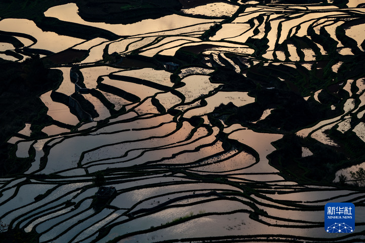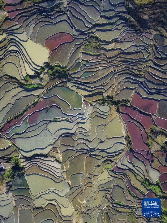 2022年1月3日,地處云南省紅河哈尼族彝族自治州元陽縣的哈尼梯田蓄水充盈,在陽光的照射下色彩豐富,美不勝收。新華社發(甘與匯攝)