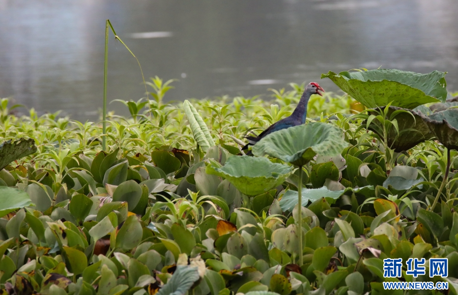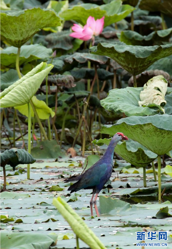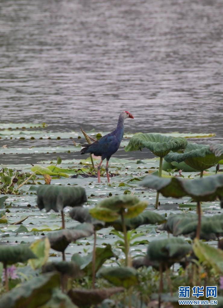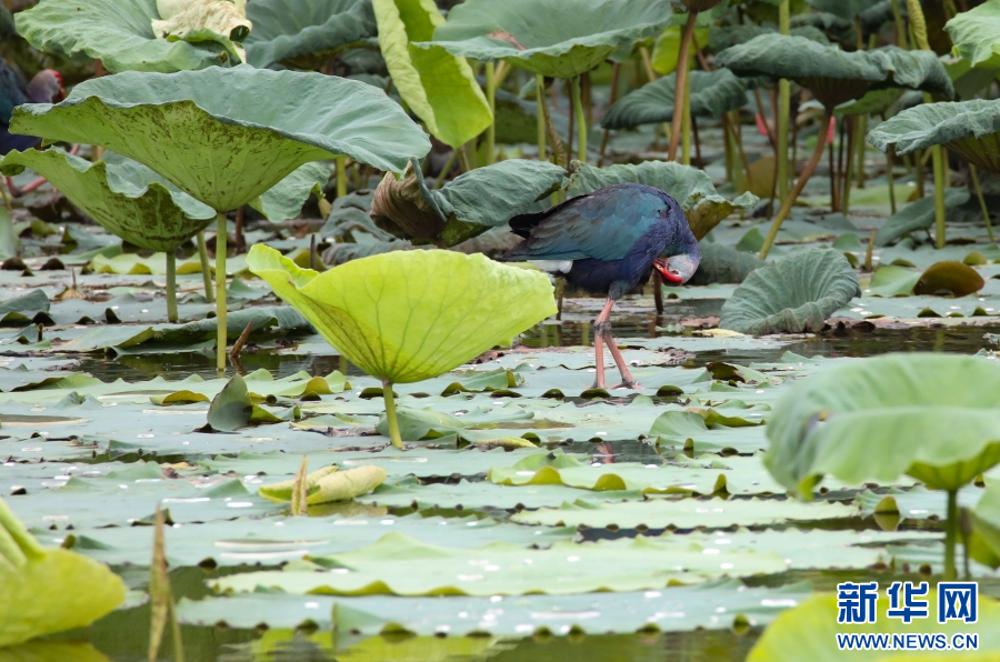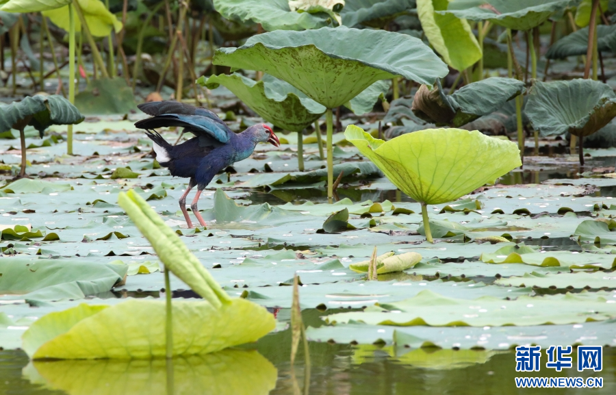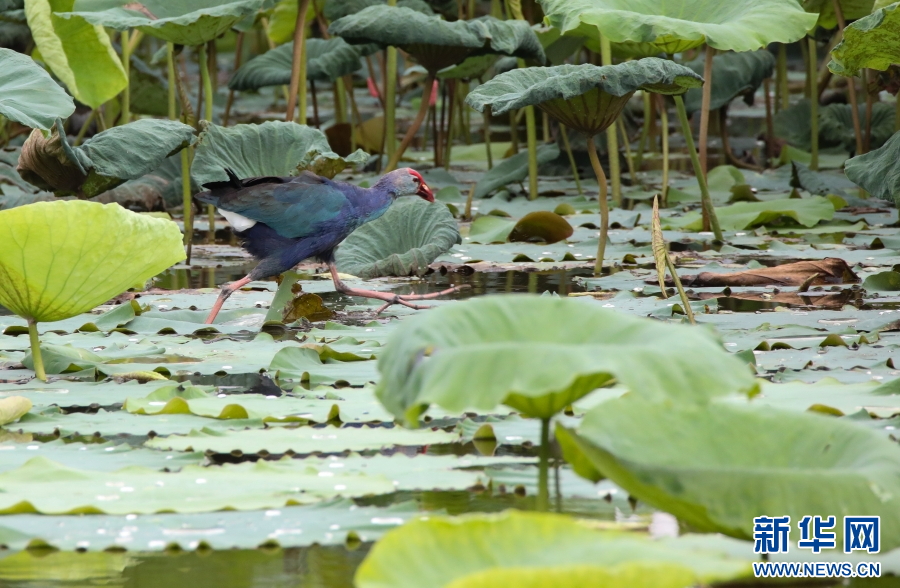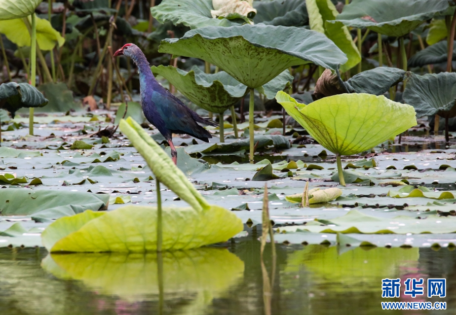 紫水雞有“最美水鳥”美譽,這種鳥兒體大而壯,羽毛藍紫色相間,并帶有閃光的綠色,非常美麗,大多棲息于有水生植物的湖泊、河漫灘或沼澤地中。新華網發(李云生 攝)