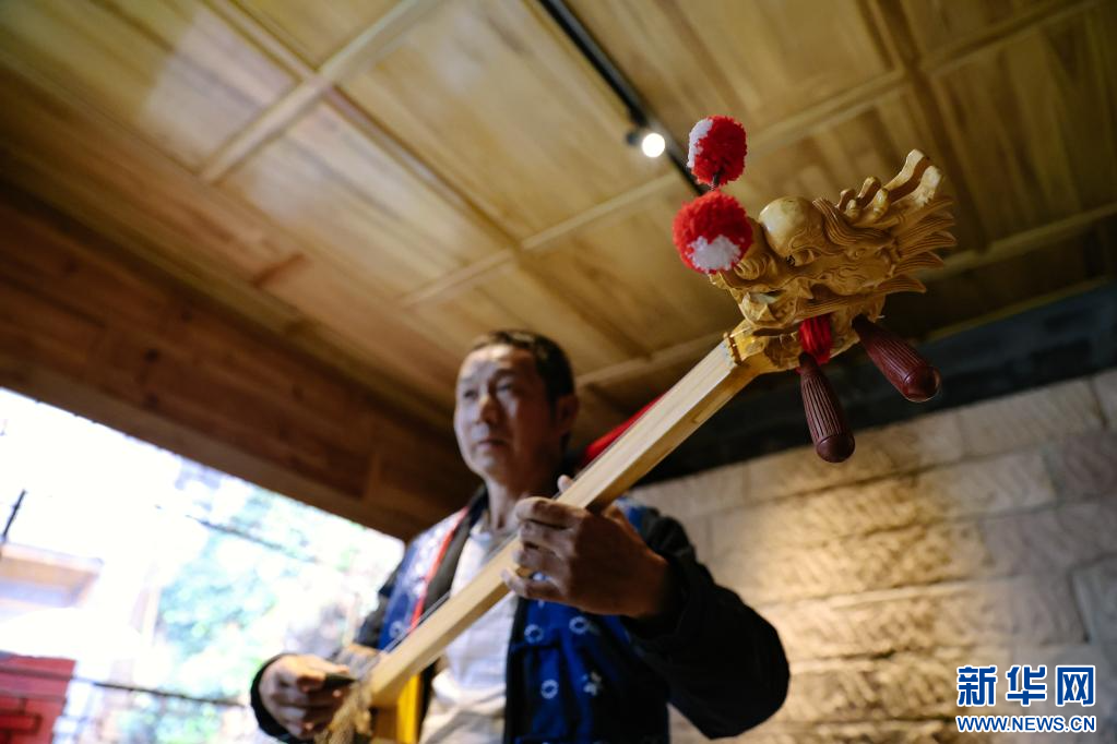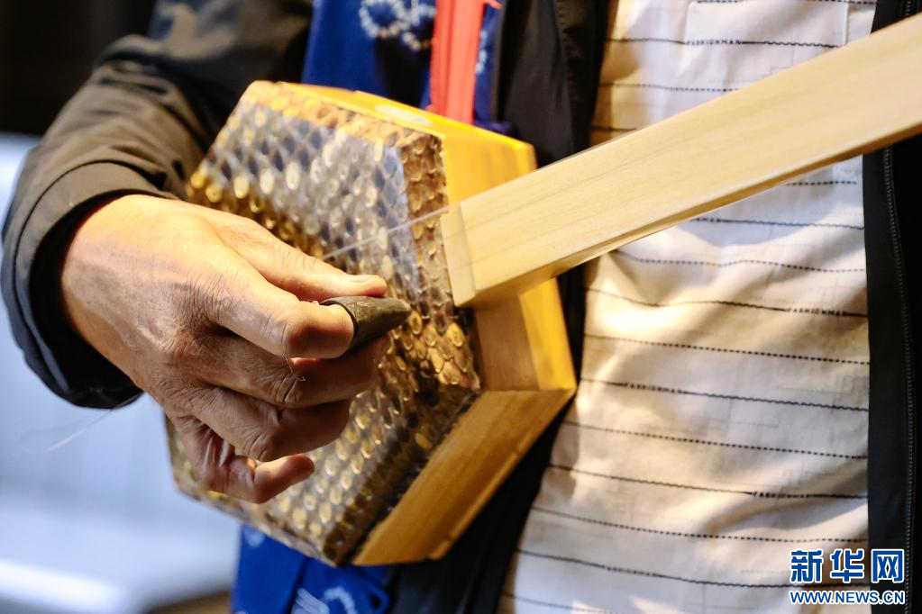 一人彈三弦伴奏(6月14日攝)。新華網發 (胡妤雅 攝)