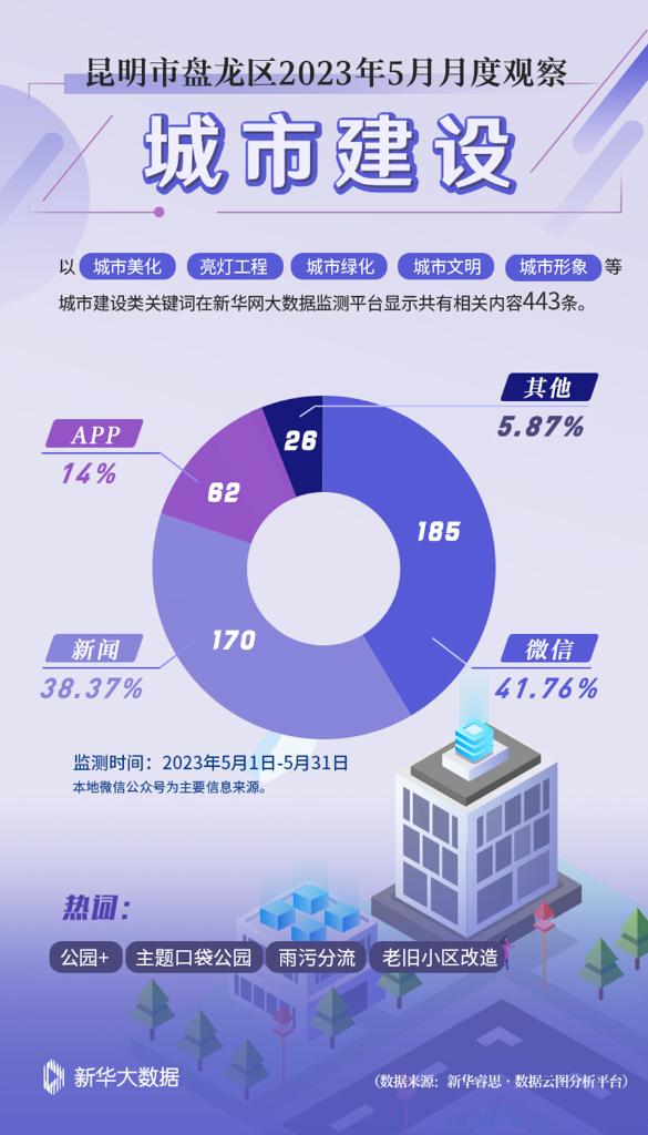 在“城市建設”主題中,以“城市美化”“亮燈工程”“城市綠化”“城市文明”“城市形象”等關鍵詞在新華網大數據監測平臺進行綜合搜索、整理、分析、研判,共梳理出有效傳播數據內容443條。其中,公園+、主題口袋公園、雨污分流、老舊小區改造成為媒體關注熱詞。