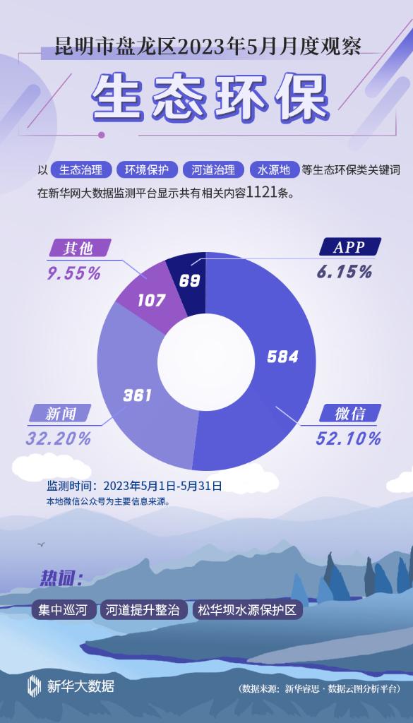 在“生態環?!敝黝}中,以“生態治理”“環境保護”“河道治理”“水源地”等關鍵詞在新華網大數據監測平臺進行綜合搜索、整理、分析、研判,共梳理出有效傳播數據內容1121條。其中,集中巡河、河道提升整治、松華壩水源保護區是媒體關注熱詞。