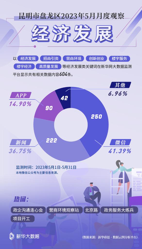 在新華網大數據監測平臺,以“經濟發展”“招商引資”“營商環境”“創新創業”“樓宇服務”“樓宇經濟”“高質量發展”等經濟發展類關鍵詞搜索,共有相關數據內容604條。其中,政企溝通連心會、營商環境觀察站、北京路、政務服務大練兵、項目開工成為當月全國媒體關注的熱詞。