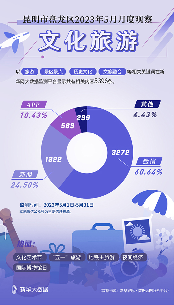 在“文化旅游”主題中,以“旅游”“景區景點”“歷史文化”“文旅融合”等關鍵詞在新華網大數據監測平臺進行綜合搜索、整理、分析、研判,共梳理出有效傳播數據5396條。其中,文化藝術節、“五一”旅游、地鐵+旅游、夜間經濟、國際博物館日成為媒體關注的熱詞。