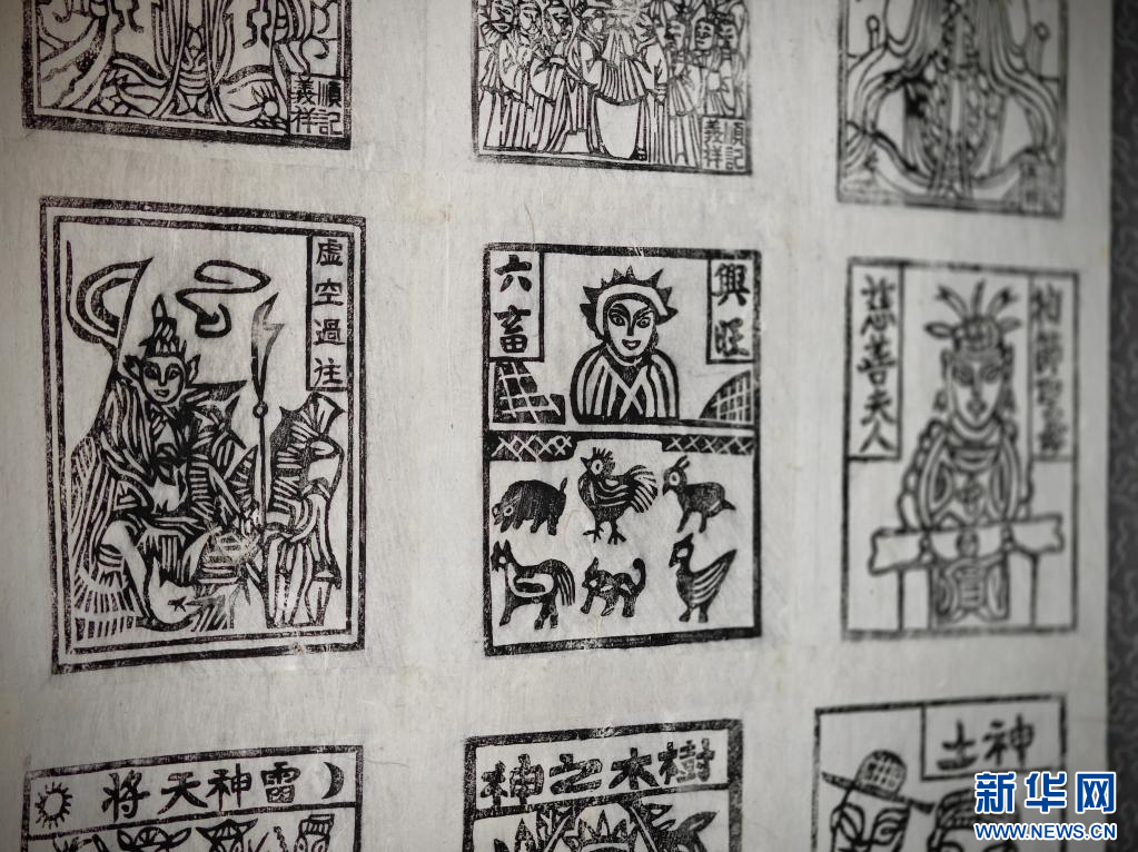 掛滿墻壁的甲馬刻版局部(6月16日攝)。新華網發(劉東 攝)