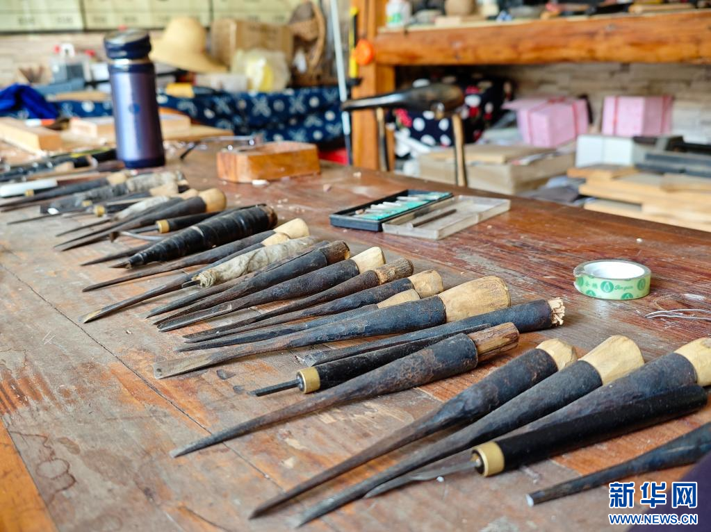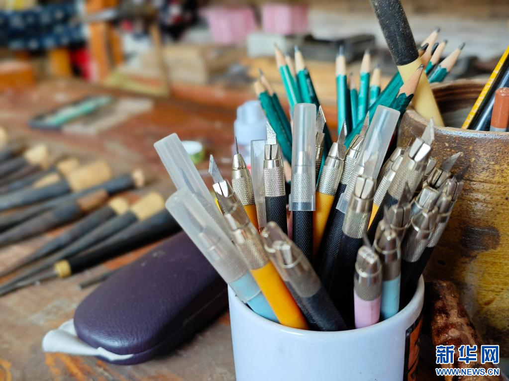 張瑞龍制作甲馬刻版的其他工具(6月16日攝)。新華網發(劉東 攝)