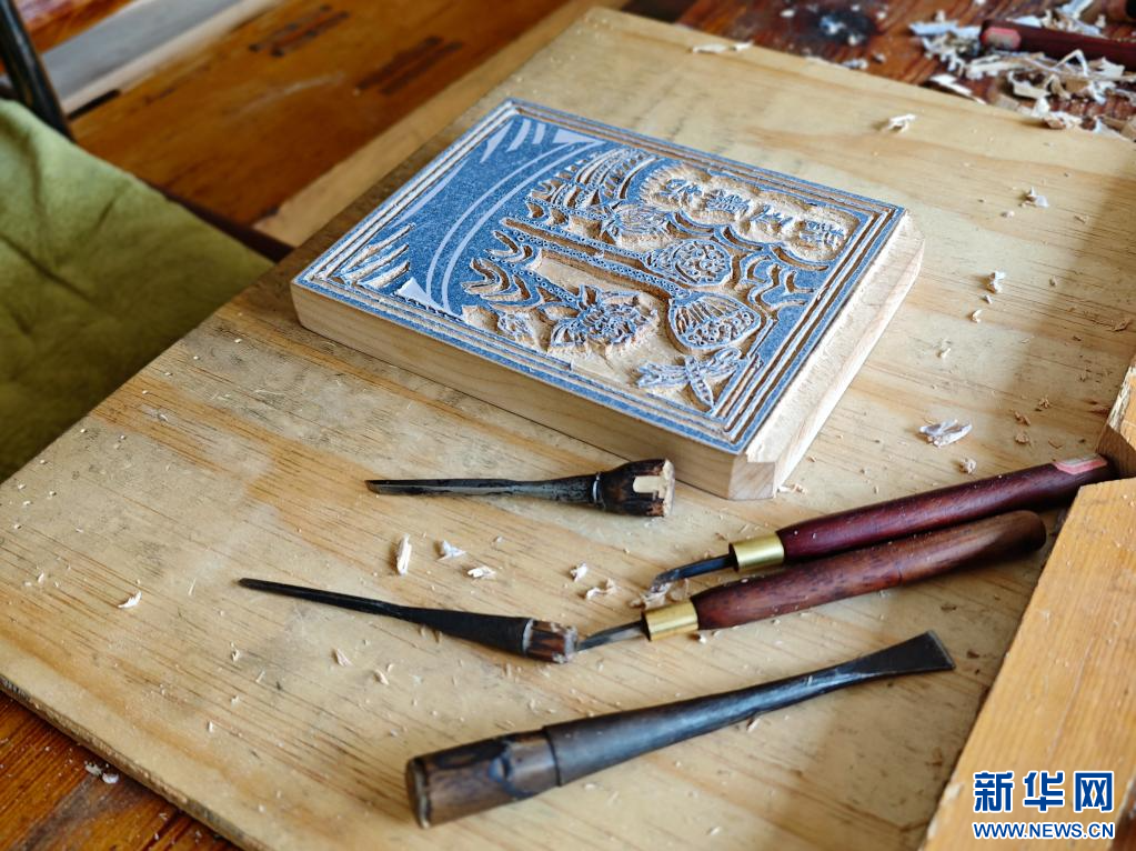待精雕細琢的甲馬刻版(6月16日攝)。新華網發(劉東 攝)
