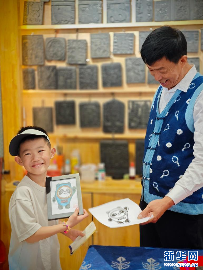 張瑞龍向孩童贈送他制作的冰墩墩甲馬(6月16日攝)。新華網發(劉東 攝)