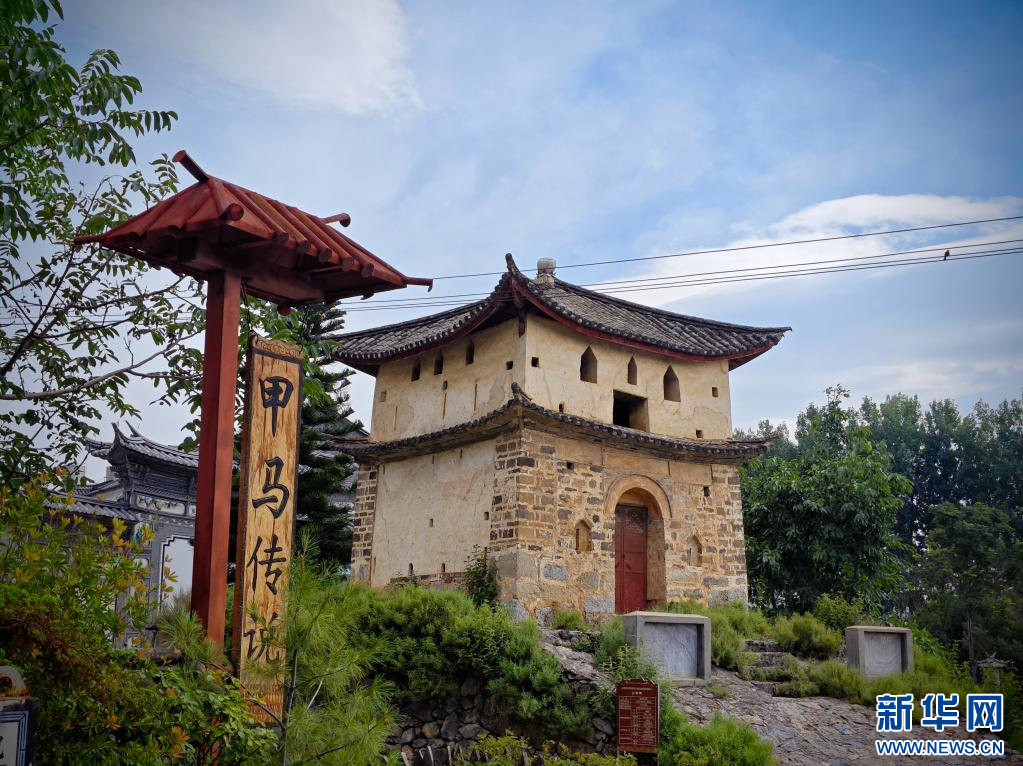 白族甲馬傳習館牌匾與龍首關遺址(6月16日攝)。新華網發(劉東 攝)