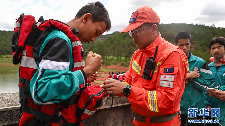 森林消防員向學生們展示水域救援裝備(攝于6月29日)。新華網發(云南省森林消防總隊保山支隊供圖)
