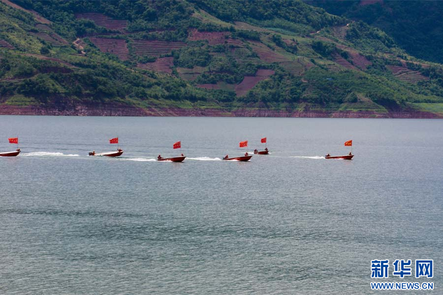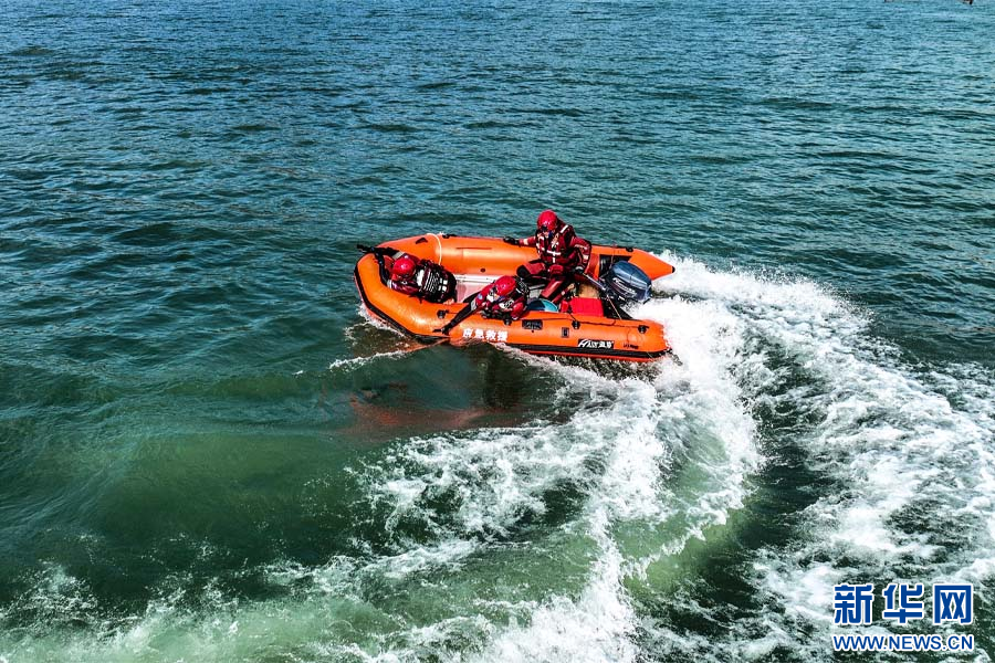 森林消防員進行舟艇編隊搜救訓練(7月1日攝)。新華網發(王兆富 攝)