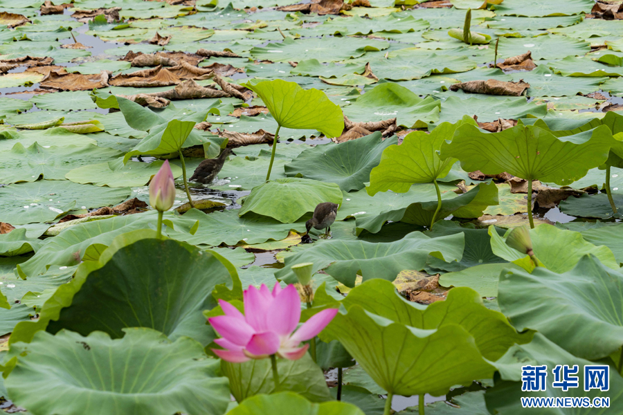 彌勒市湖泉生態園內綻放的荷花與在此棲息的鳥類(6月11日攝)。新華網發(鄭益 攝)