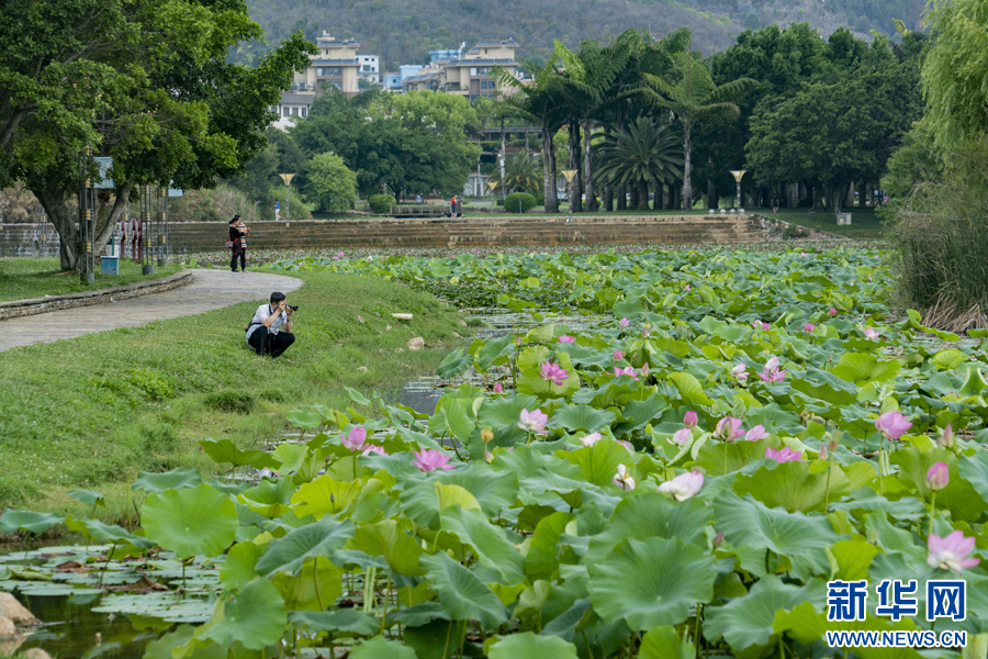 彌勒市湖泉生態園內在此拍照的游客(6月11日攝)。新華網發(鄭益 攝)