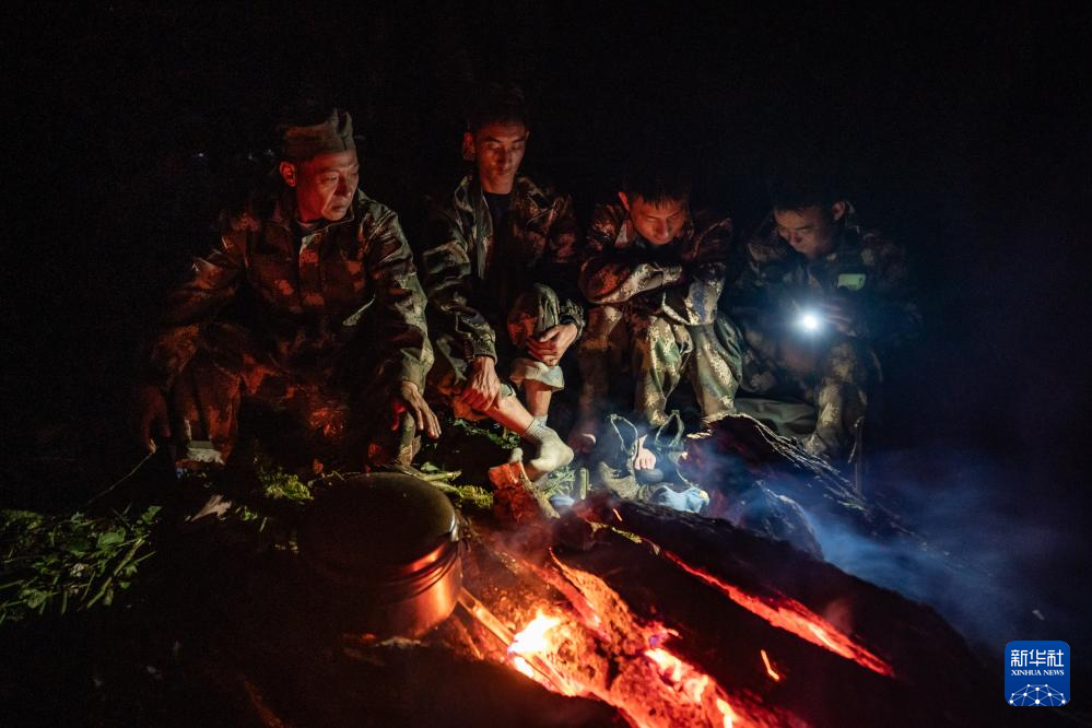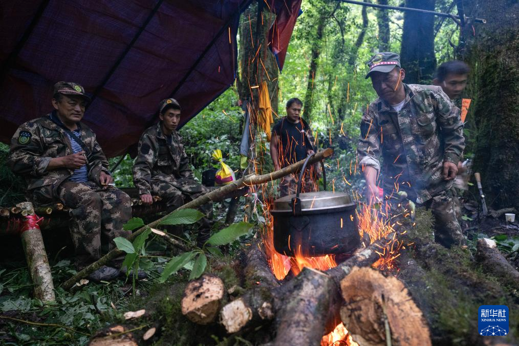 7月8日,在高黎貢山國家自然保護區,巡護隊員圍在篝火旁做飯并烤干濕衣服。