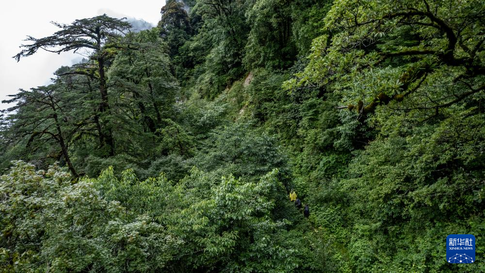 巡護隊員在高黎貢山國家級自然保護區巡護(無人機照片,7月9日攝)。