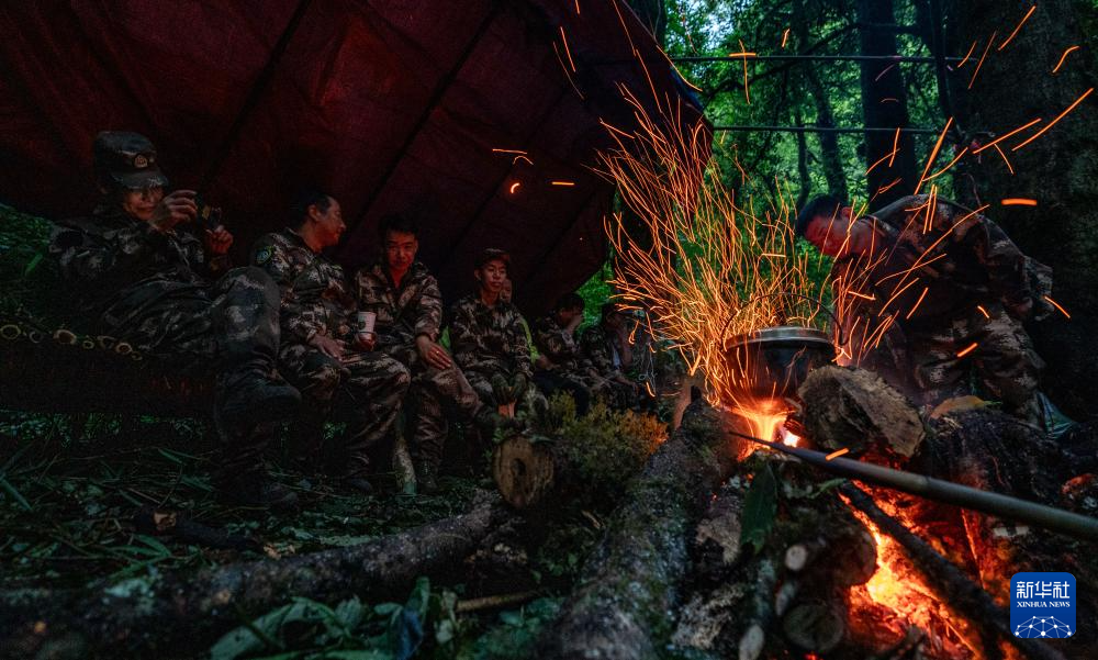 7月8日,在高黎貢山國家自然保護區,巡護隊員在篝火旁休息。