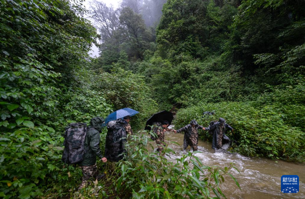 7月8日,在高黎貢山國家級自然保護區,巡護隊員互相幫助蹚過湍急的溪流。