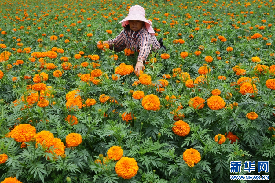 花農正在采摘萬壽菊(7月24日攝)。新華網發(楊俊鵬 攝)