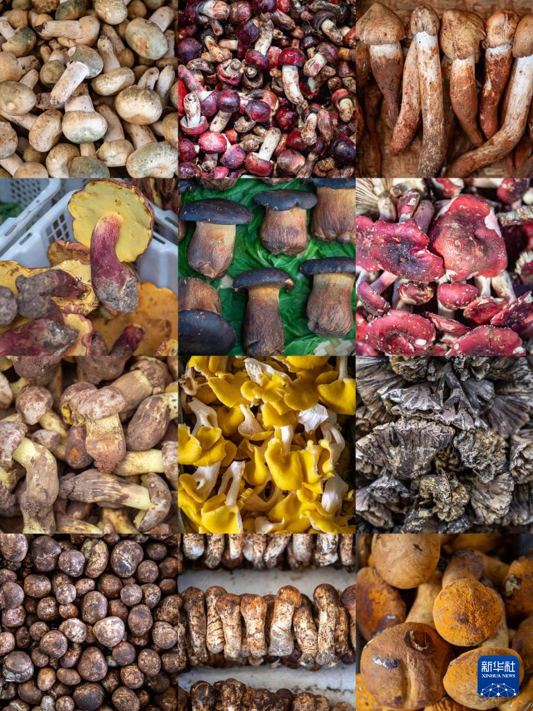 昆明野生菌交易市場上熱銷的野生菌(拼版照片)。新華社記者 江文耀 攝