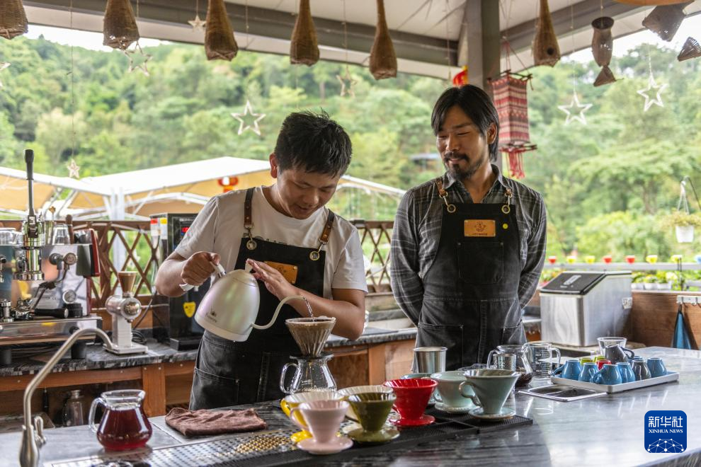 普洱市的咖啡師正在為游客制作咖啡。新華社記者 曹夢瑤 攝