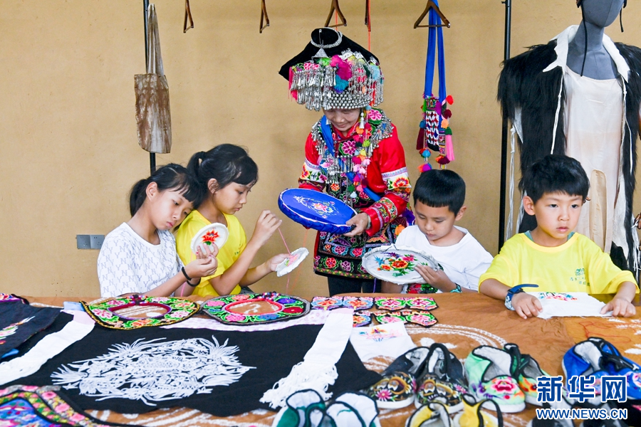 魯仙秀正在給學生們講解彝族刺繡技藝(資料圖)。新華網發(適志宏 攝)