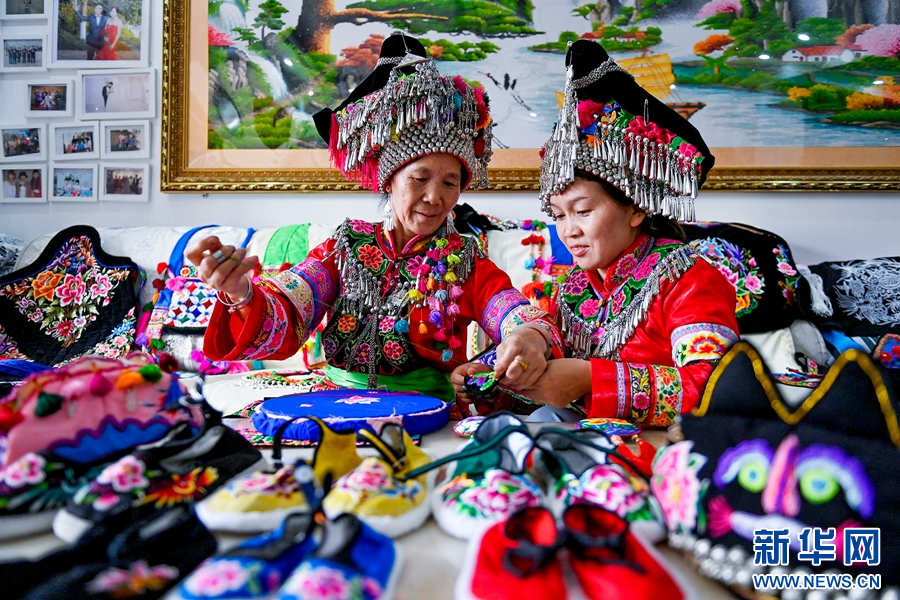魯仙秀(左)指點女兒魯文燕刺繡(資料圖)。新華網發(適志宏 攝)