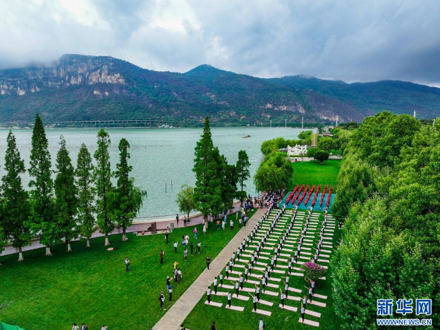 2023年6月20日,太極拳練習者和瑜伽練習者在云南昆明滇池之畔練習。新華社發(顧王睿 攝)