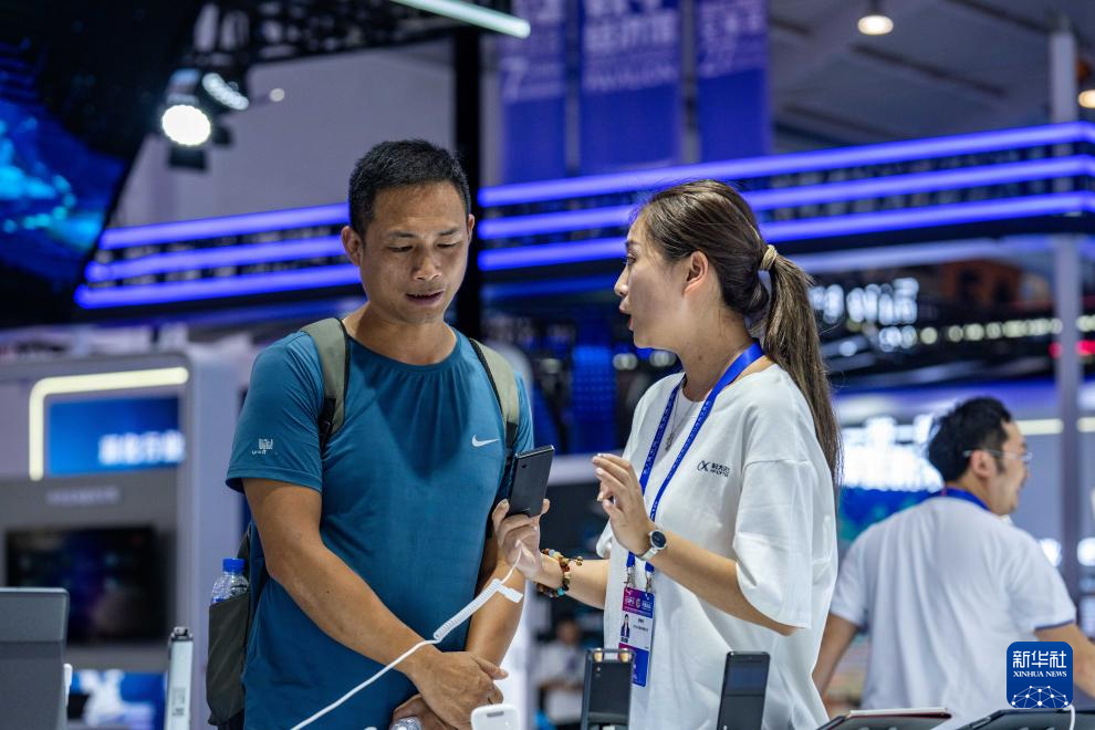 8月16日,客商(左)在第七屆中國—南亞博覽會科大訊飛展區了解翻譯設備。新華社記者 胡超 攝