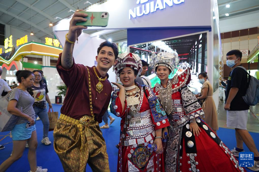 身著民族服裝的年輕人在第七屆中國—南亞博覽會上拍照留念(8月17日攝)。新華社記者 陳欣波 攝