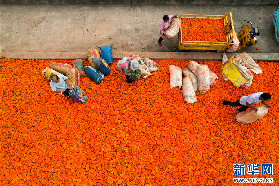 8月13日,云南省曲靖市沾益區白水鎮勺達村萬壽菊收購點,工作人員在花池內整理萬壽菊。