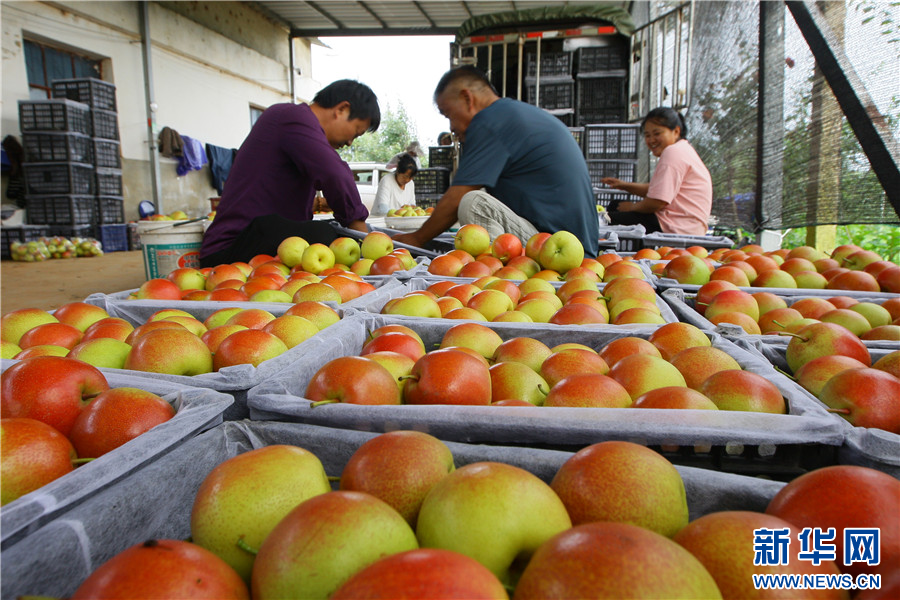 8月16日,云南省曲靖市沾益區大坡鄉大坡村一處果園內,果農分揀美人酥紅梨。
