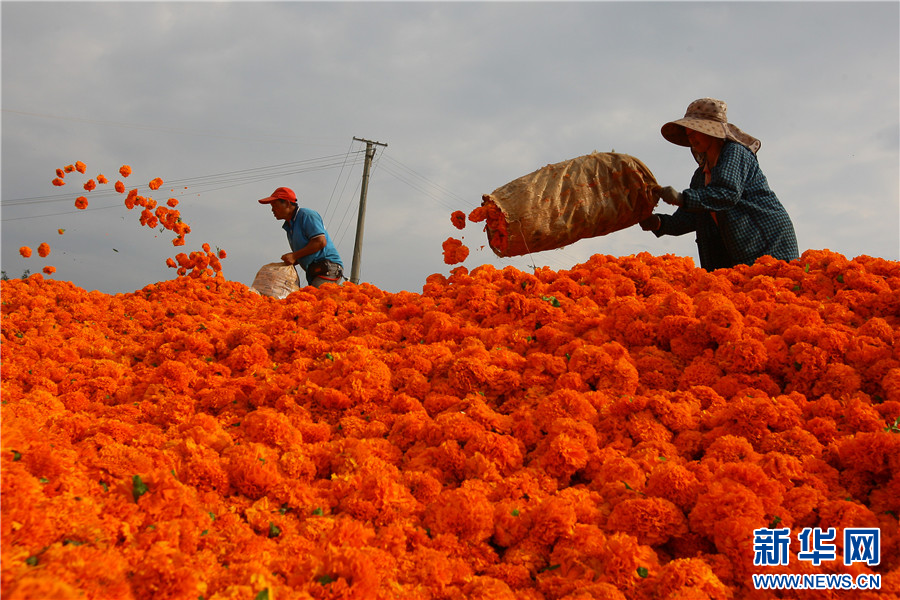 8月13日,云南省曲靖市沾益區白水鎮中心村,花農將萬壽菊倒入車箱。