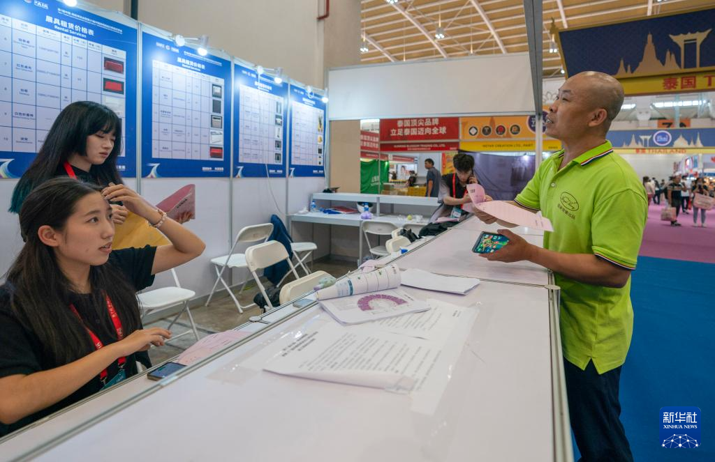 陳杰在昆明滇池國際會展中心內的服務臺領取提貨單(8月18日攝)。