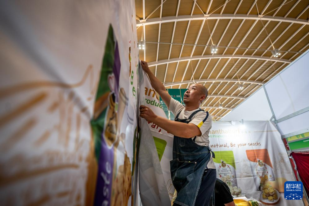 8月14日,泰國華商陳杰在南博會開幕前布置展區。