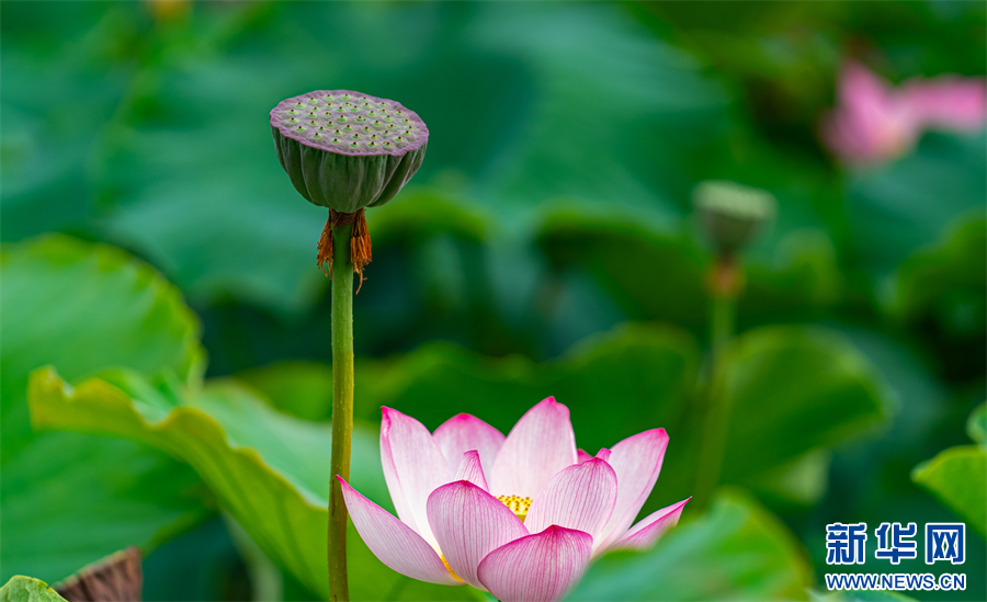 荷花與蓮蓬相互映襯(8月23日攝)。新華網發(宋光旭 攝)