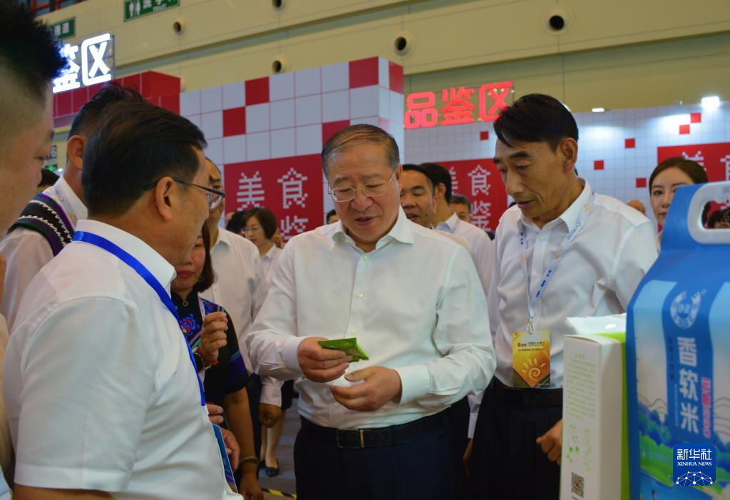 云南省糧食和物資儲備局局長徐鵬聲(右一)向國家糧食和物資儲備局黨組書記劉煥鑫(中)介紹高原特色糧油。