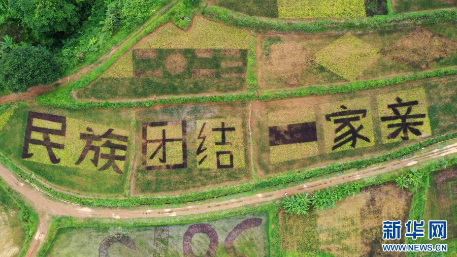 彩色稻田里“民族團結一家親”字樣(8月22日攝)。新華網發(陶平 攝 )