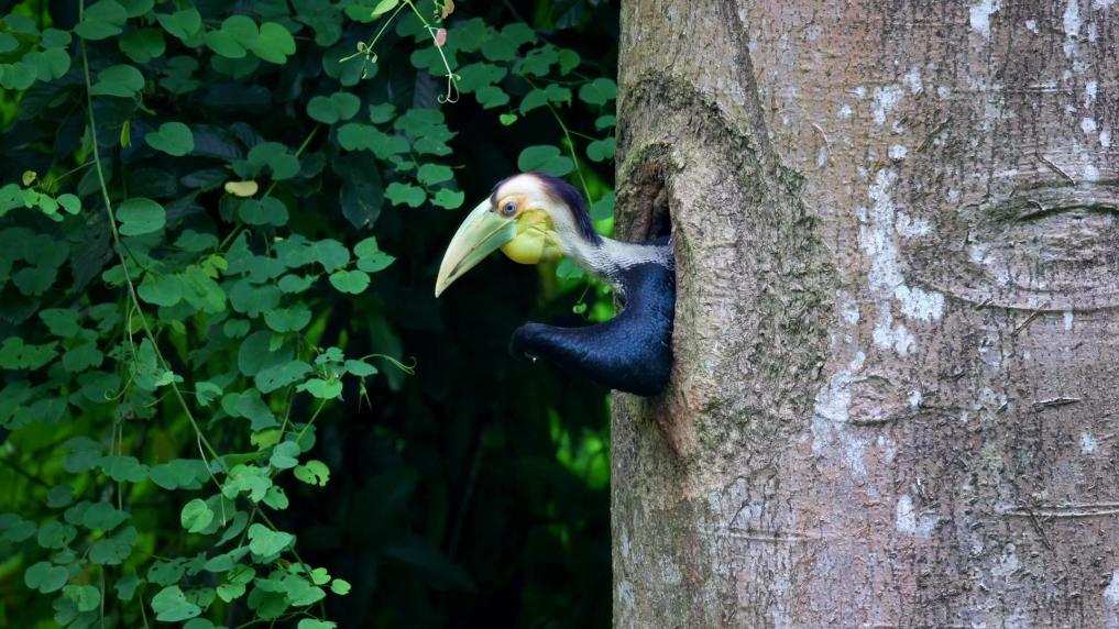 樹巢里的犀鳥寶寶也開始探出可愛的小腦袋,打量著樹巢外的世界。在多次觀察和適應后,犀鳥寶寶也學著媽媽把身體往外擠,經過不斷嘗試后最終飛出了樹巢,在犀鳥父母的帶領下,飛向熱帶雨林深處。