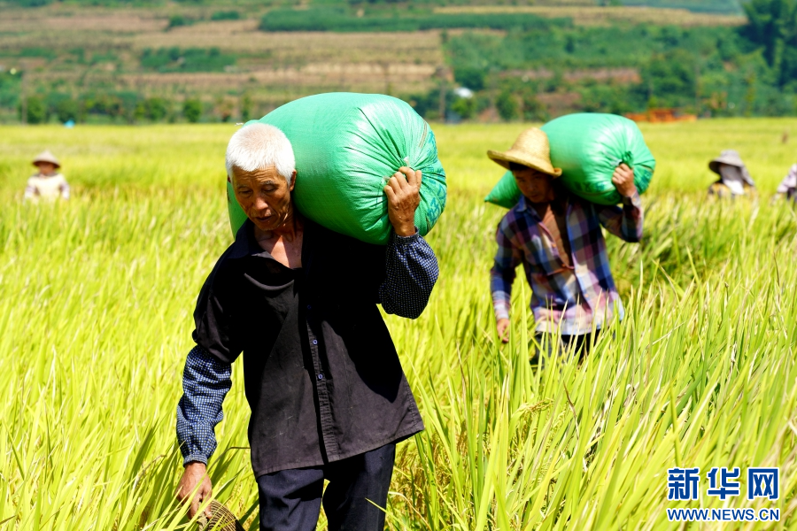 群眾搬運收割好的稻谷(9月3日攝)。新華網發(劉子安 攝)