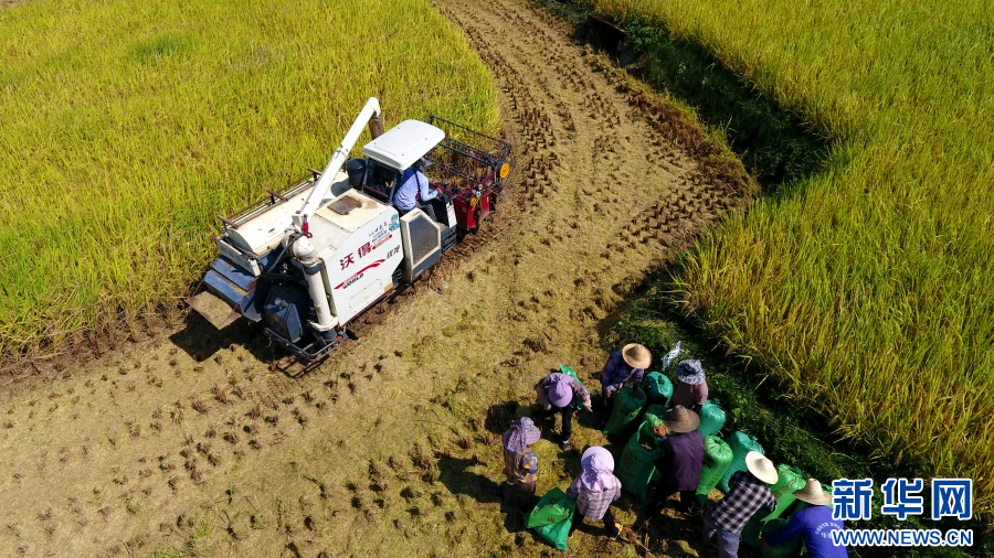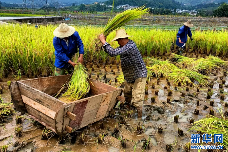 群眾在收割水稻(9月3日攝)。 新華網發(范珈屹 攝)