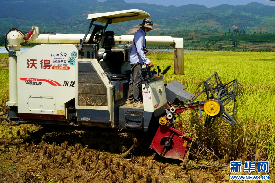 群眾使用收割機收割水稻(9月3日攝)。新華網發(劉子安 攝)