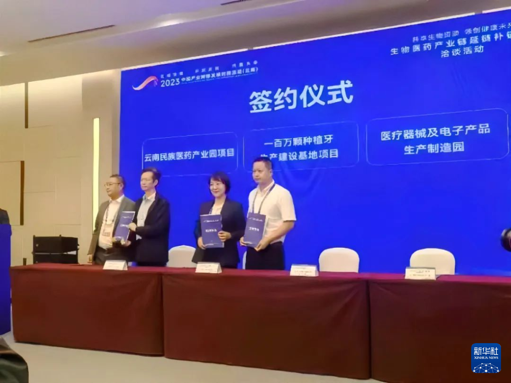 在生物醫藥產業鏈延鏈補鏈強鏈洽談專題活動中,昆明高新區生物醫藥產業專員代表昆明高新區與云南省民族商會、江陰金泰克生物技術有限公司、眾盈光電科技(深圳)有限公司分別簽訂了云南民族醫藥產業園項目戰略合作協議、一百萬顆種植牙生產建設基地意向協議、昆明高新區醫療器械及電子信息產業東部轉移承接示范園投資協議。