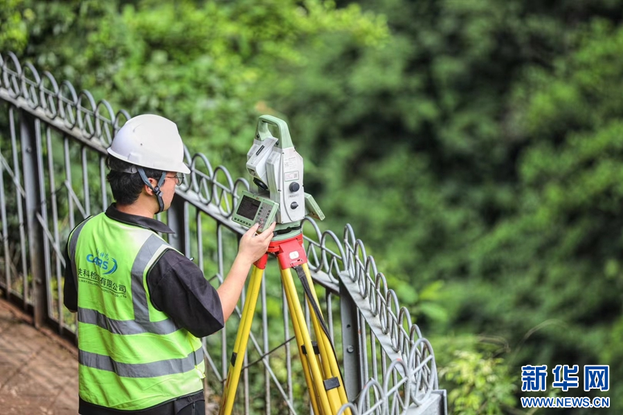 工作人員正在使用儀器采集人字橋數據(攝于9月6日)。新華網發(楊紫軒 攝)
