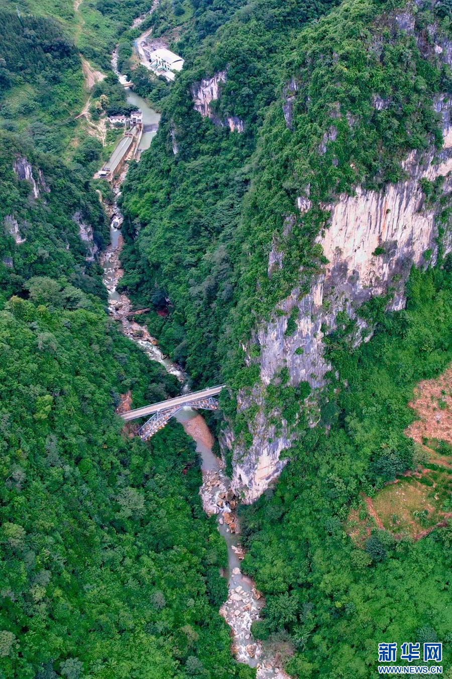 航拍視角下,架設在懸崖峭壁間的人字橋(攝于9月6日)。新華網發(楊紫軒 攝)