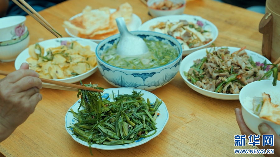 白族家常菜,中間的一碗為“海菜芋頭湯”。(視頻截圖)