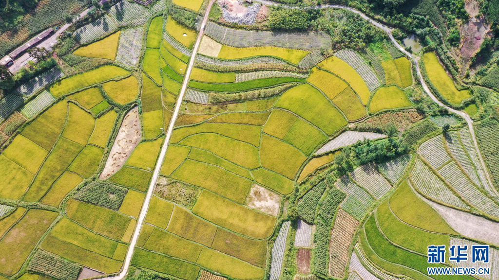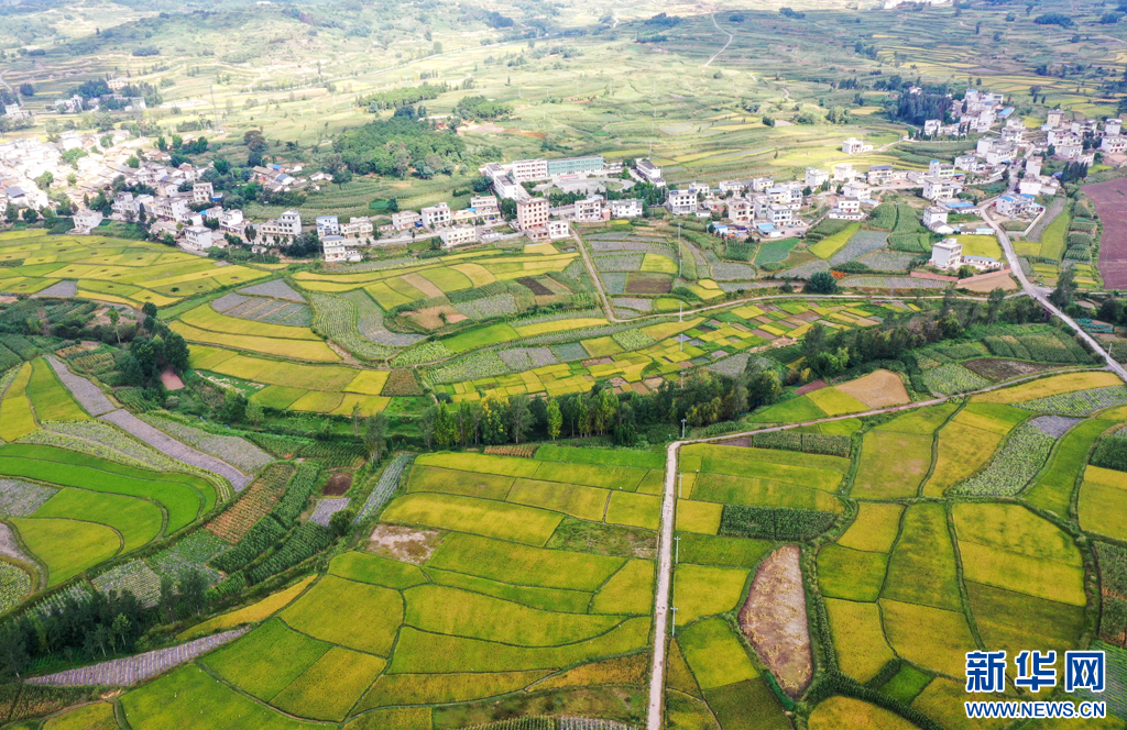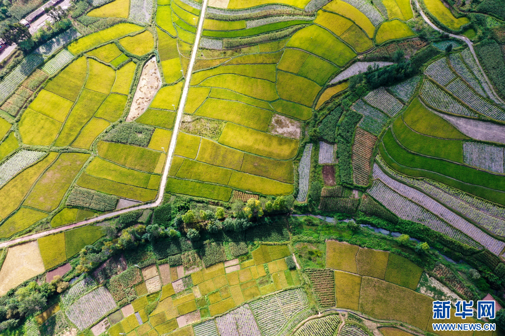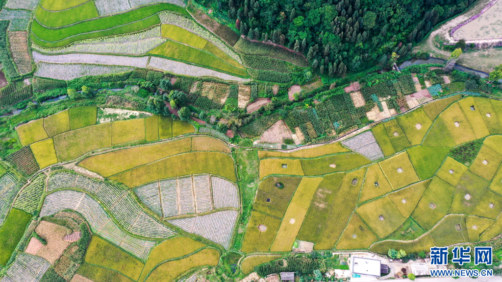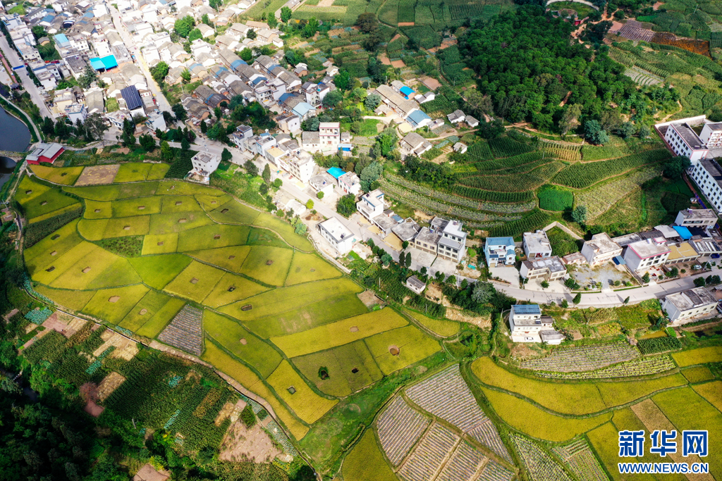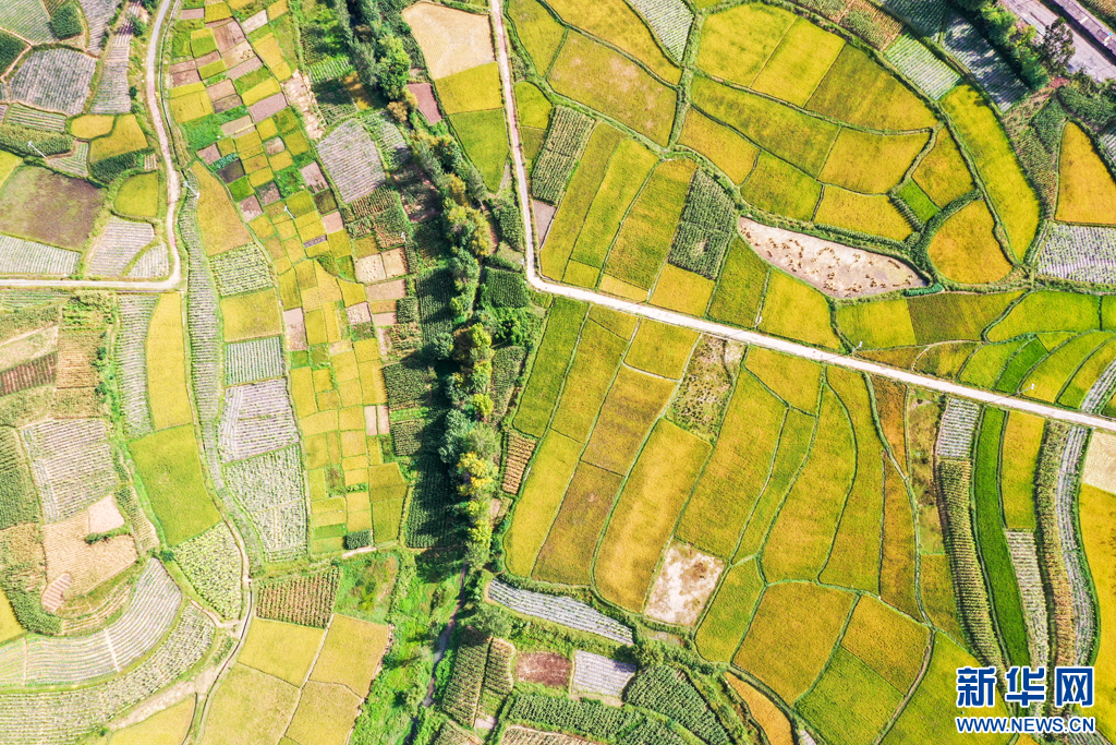 俯瞰稻黃鄉村美(9月25日攝)。新華網發(孫文來 攝)