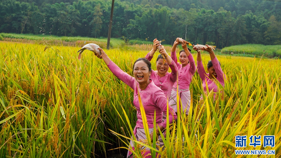 農戶們開心地向大家展示抓到的魚 (10月5日攝)。新華網發(孔扎選晶 攝)