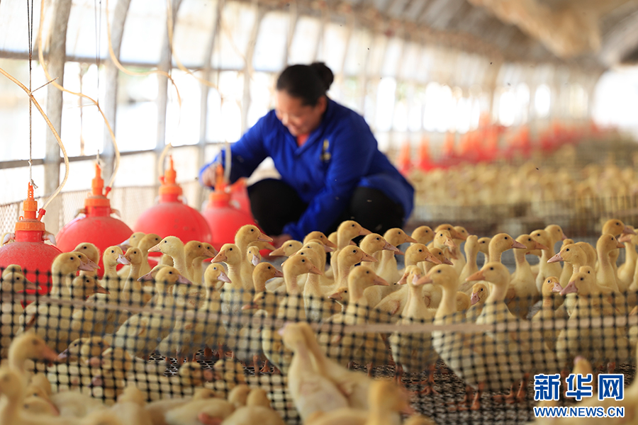 工作人員在鴨棚里檢查鴨子情況(攝于5月18日)。新華網 趙普凡 攝