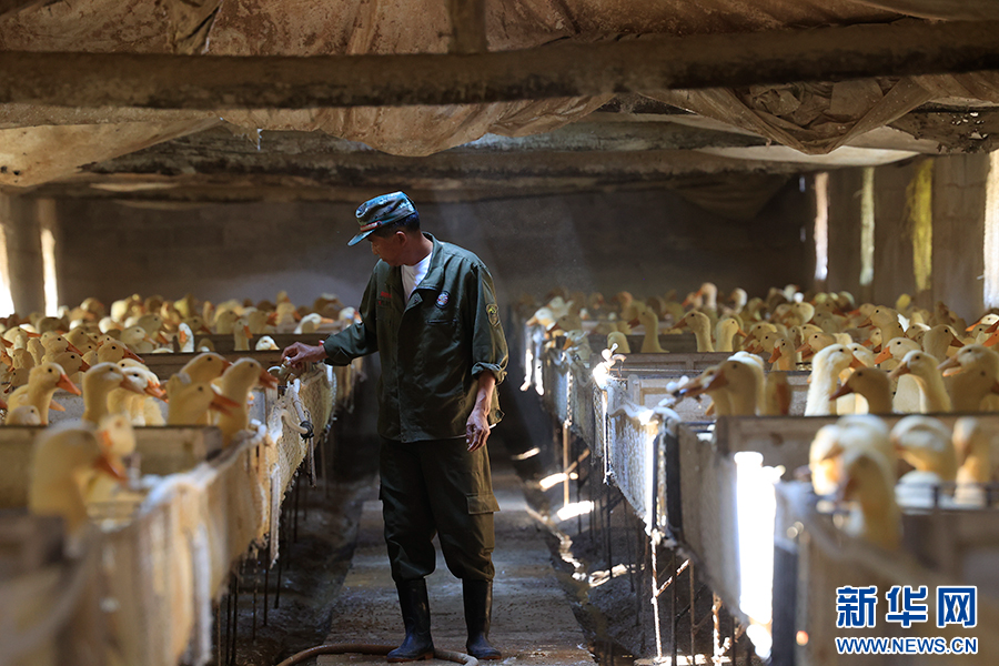 楊明光在鴨棚里檢查相應設施情況(攝于5月18日)。新華網 趙普凡 攝